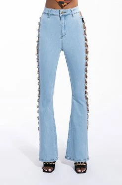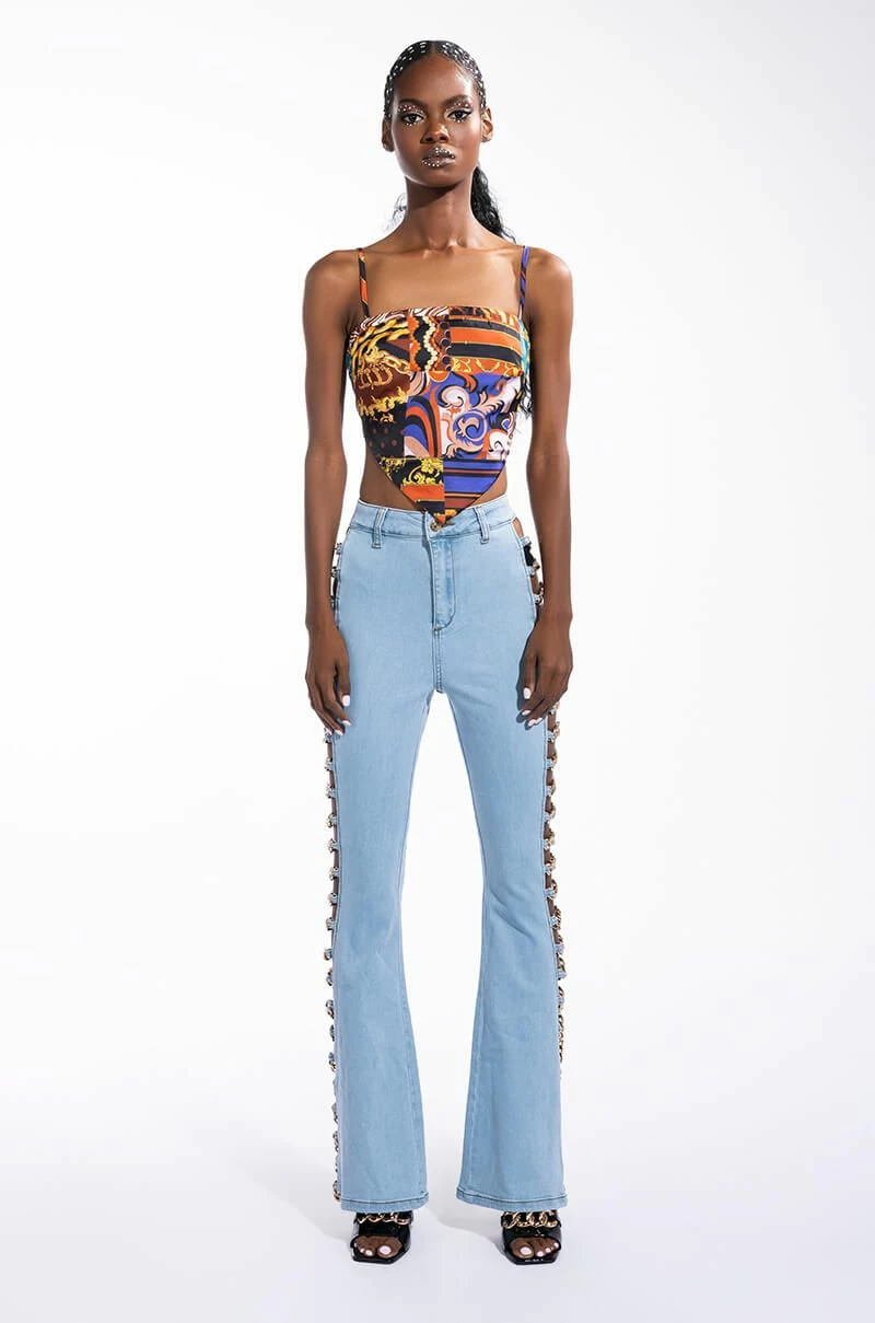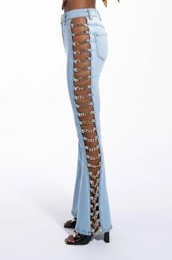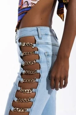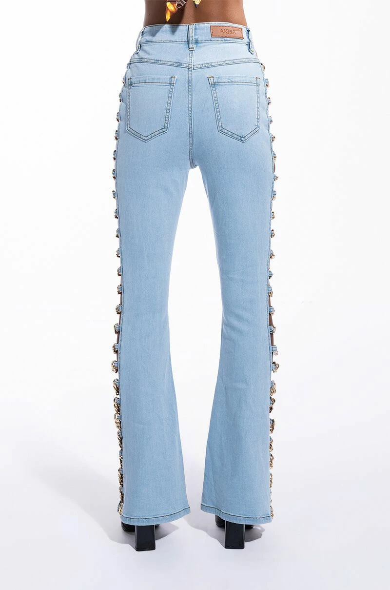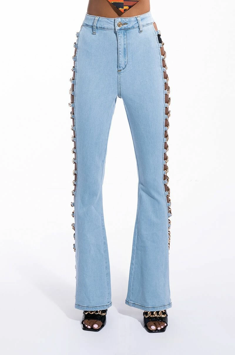 Step to the beat of your own vibrations with The AKIRA Label New Sensation Chain Detail High Waisted Flare Jeans. These stretch denim pants feature cut out side detailing, chunky chain link accents, a high rise waist, and a retro flare leg silhouette. Complete with working belt loops, back pockets, and a button up and zipper closure. Pair with a cute cropped halter, and slay the day away.