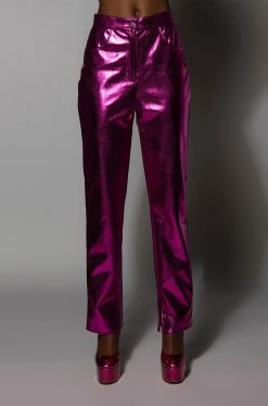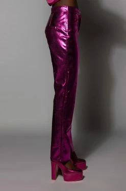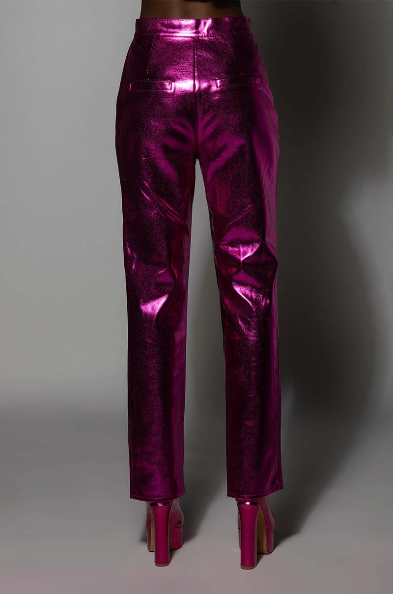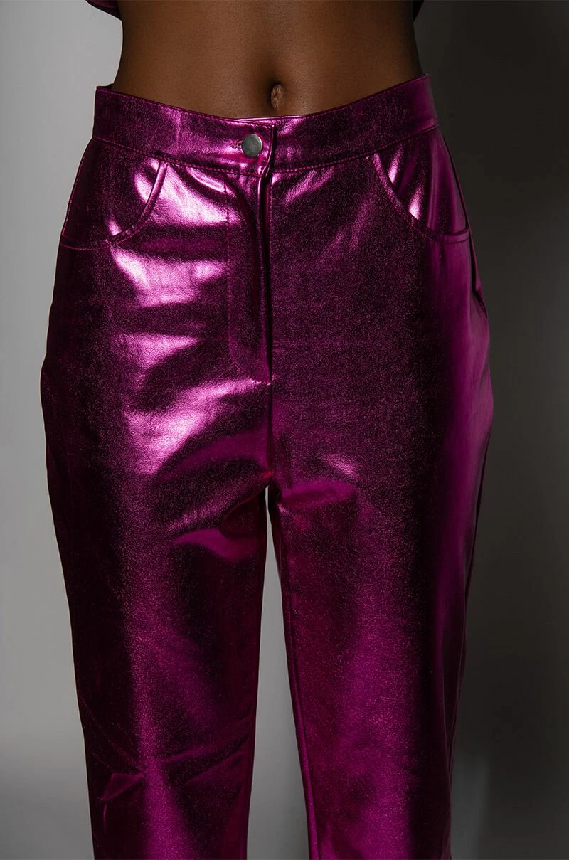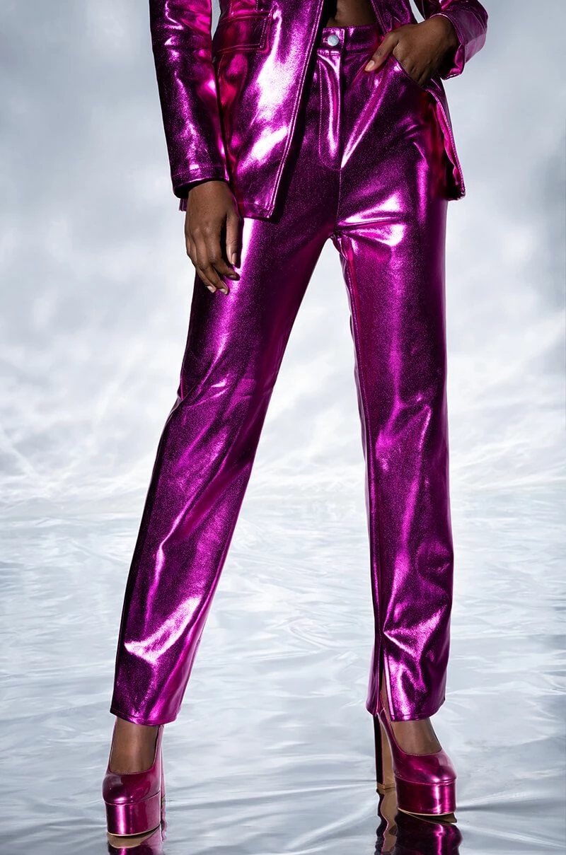 Level up in the New Year with The AKIRA Label New Vibration Metallic Trouser! This eye-catching pant is made with a metallic, vegan leather fabrication and features a straight leg silhouette, deep front pockets, a classic zip-up button closure, faux back pockets, and inner slits at the ankle. Pair with the coordinating The AKIRA Label New Vibration Metallic Blazer and platform pumps to complete that boss babe look!