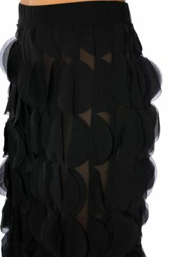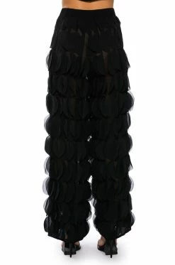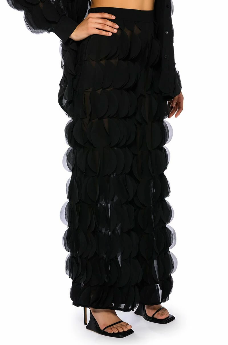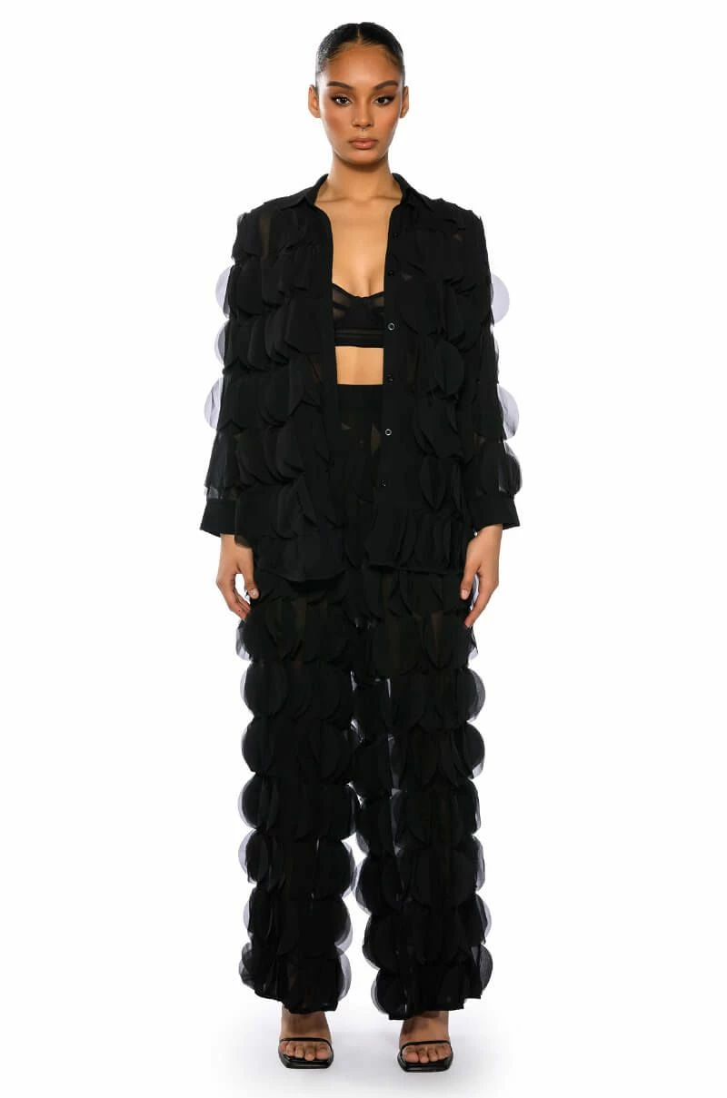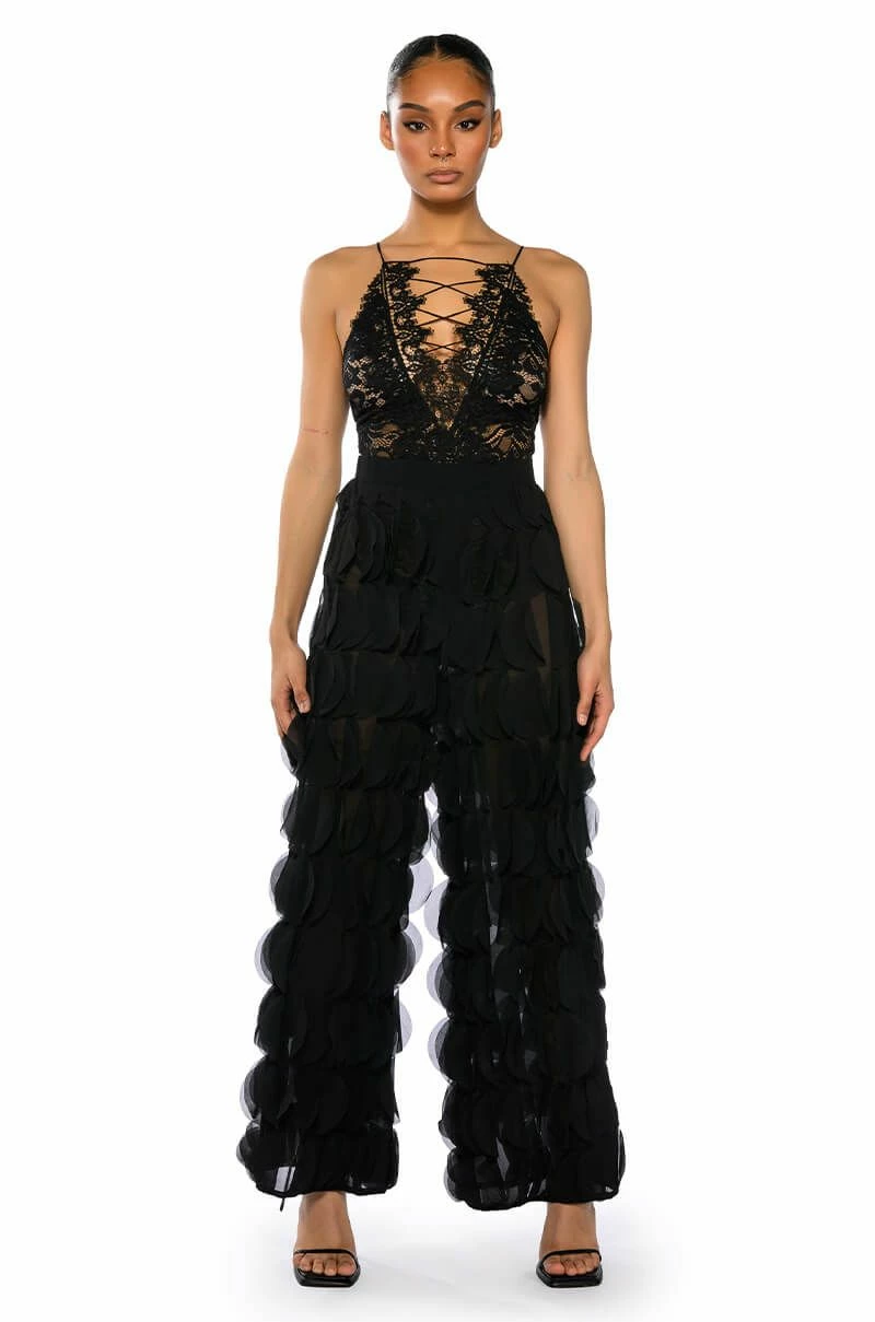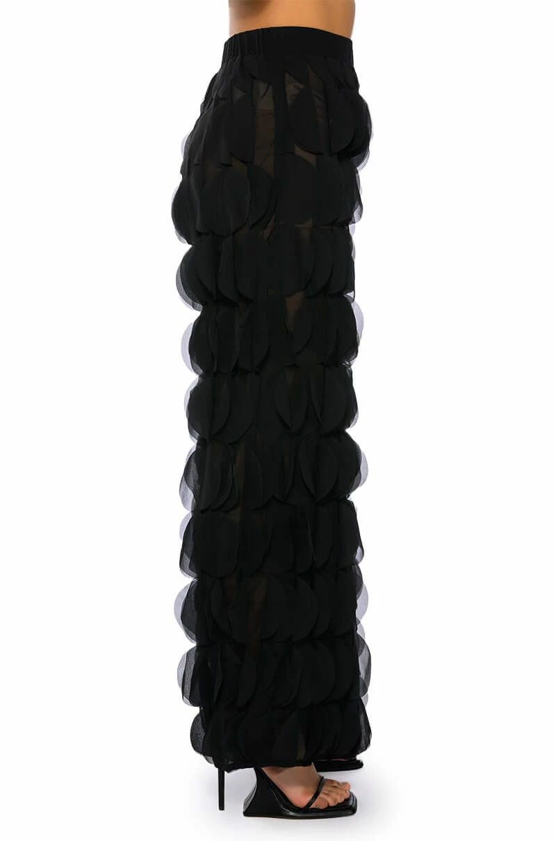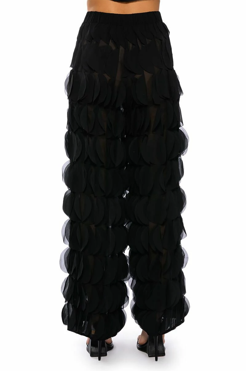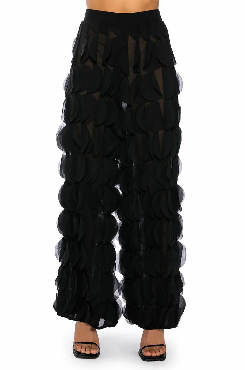 The AKIRA Label Next Time Textured Wide Leg Pant features a sheer mesh base, a high rise waist, a wide elastic waistband, ruffled petal panel detailing throughout, and a wide leg silhouette. Style this piece with the matching AKIRA Label Next Time Textured Button Down Blouse to finish off your look.