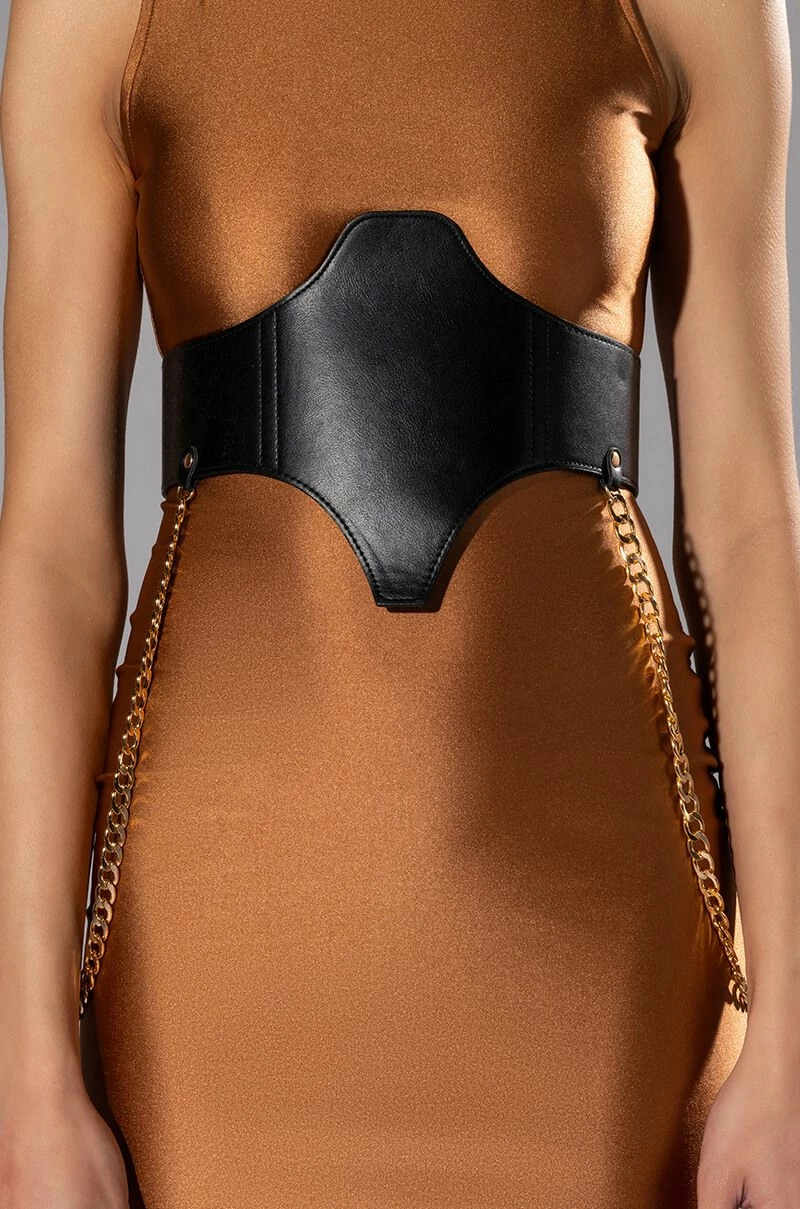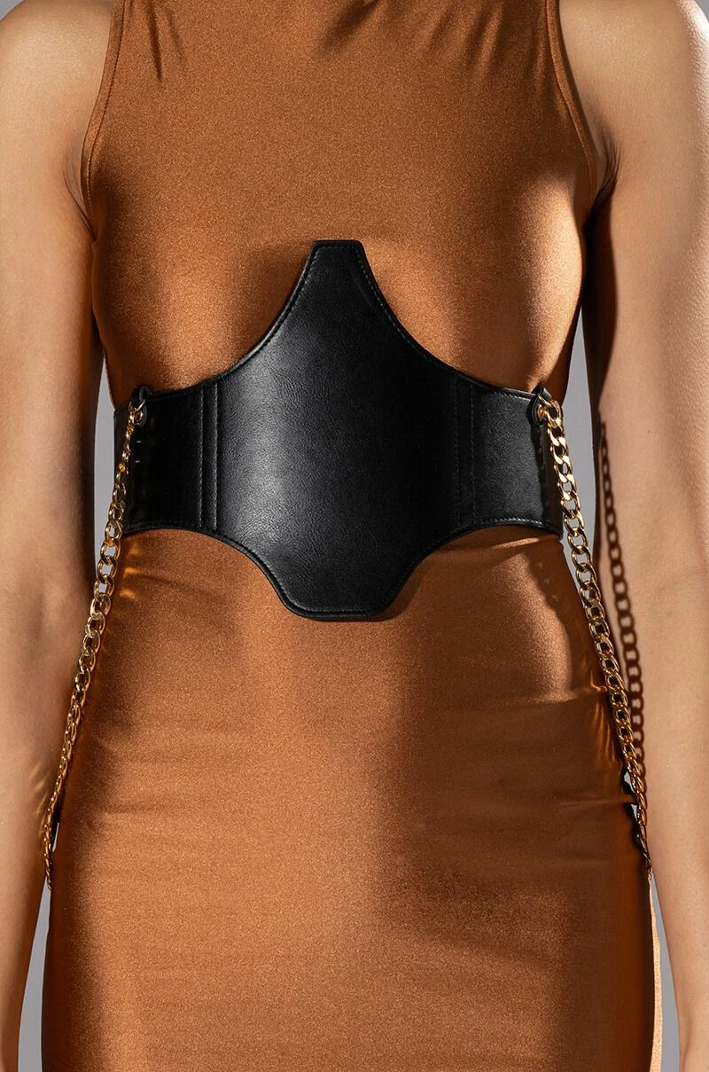 The AKIRA Label Nitty Gritty Faux Leather Harness features a pointed curved bottom, an unjust silhouette, a wide vegan leather base, and faux gold chain link strap accents. Complete with button back closures.
