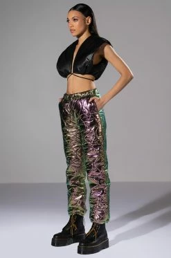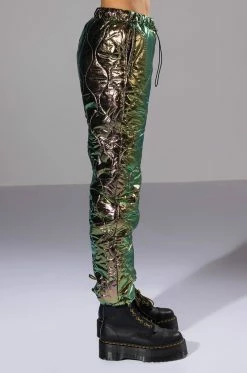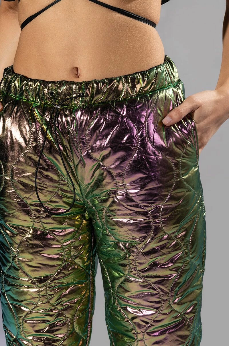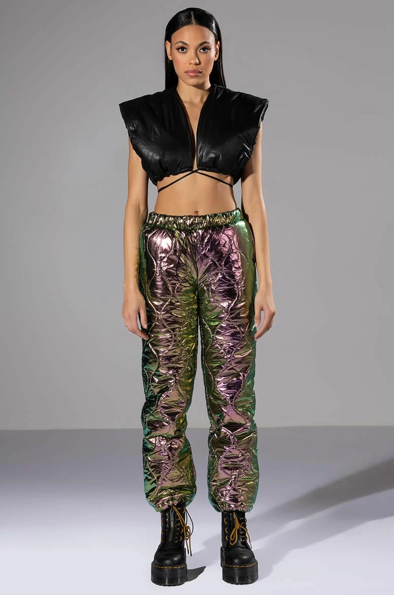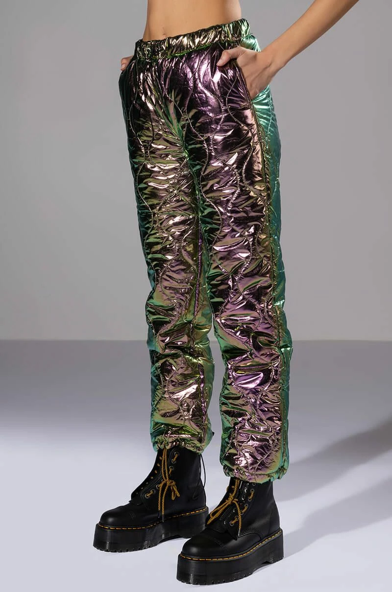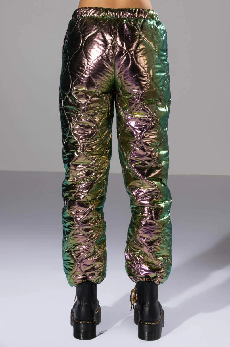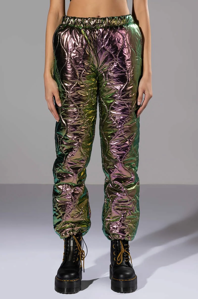 We’re staying unbothered in The AKIRA Label Not A Care Metallic Quilted Pant! This bold piece is made from a thick, glimmering quilted fabrication and features an elastic drawstring toggle waistband, polyester lining, a straight leg design and drawstring toggles at the hems. These iridescent high-waisted pants are perfect for a bold – yet cozy – effortless look!
