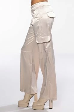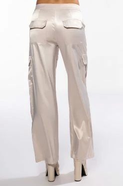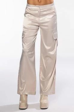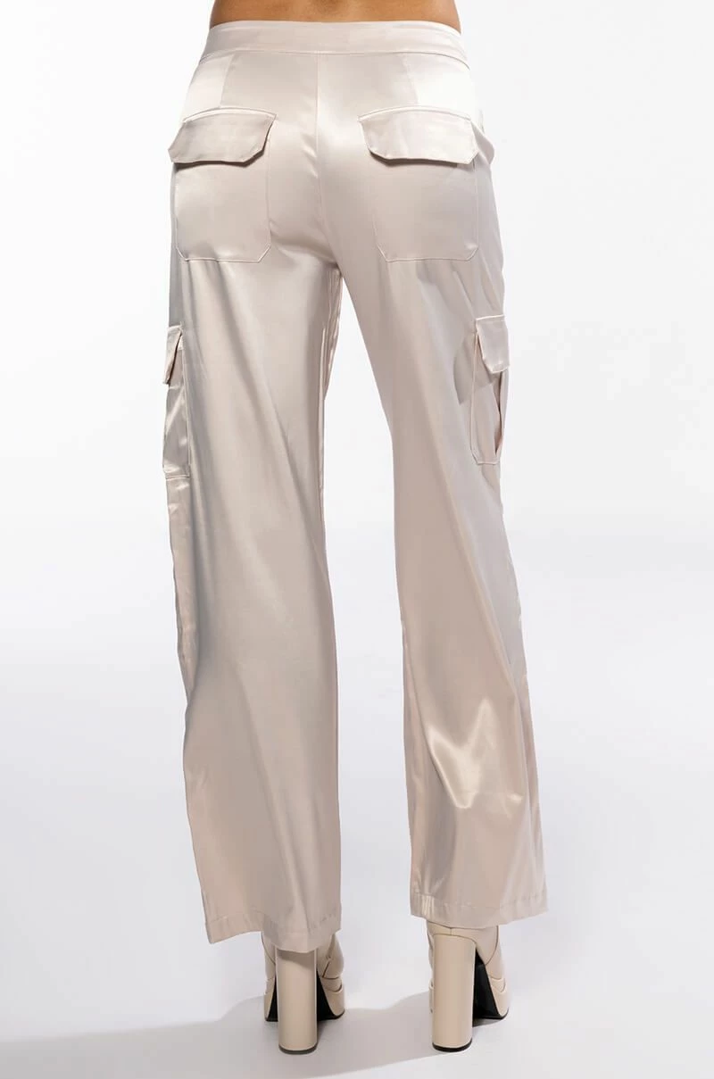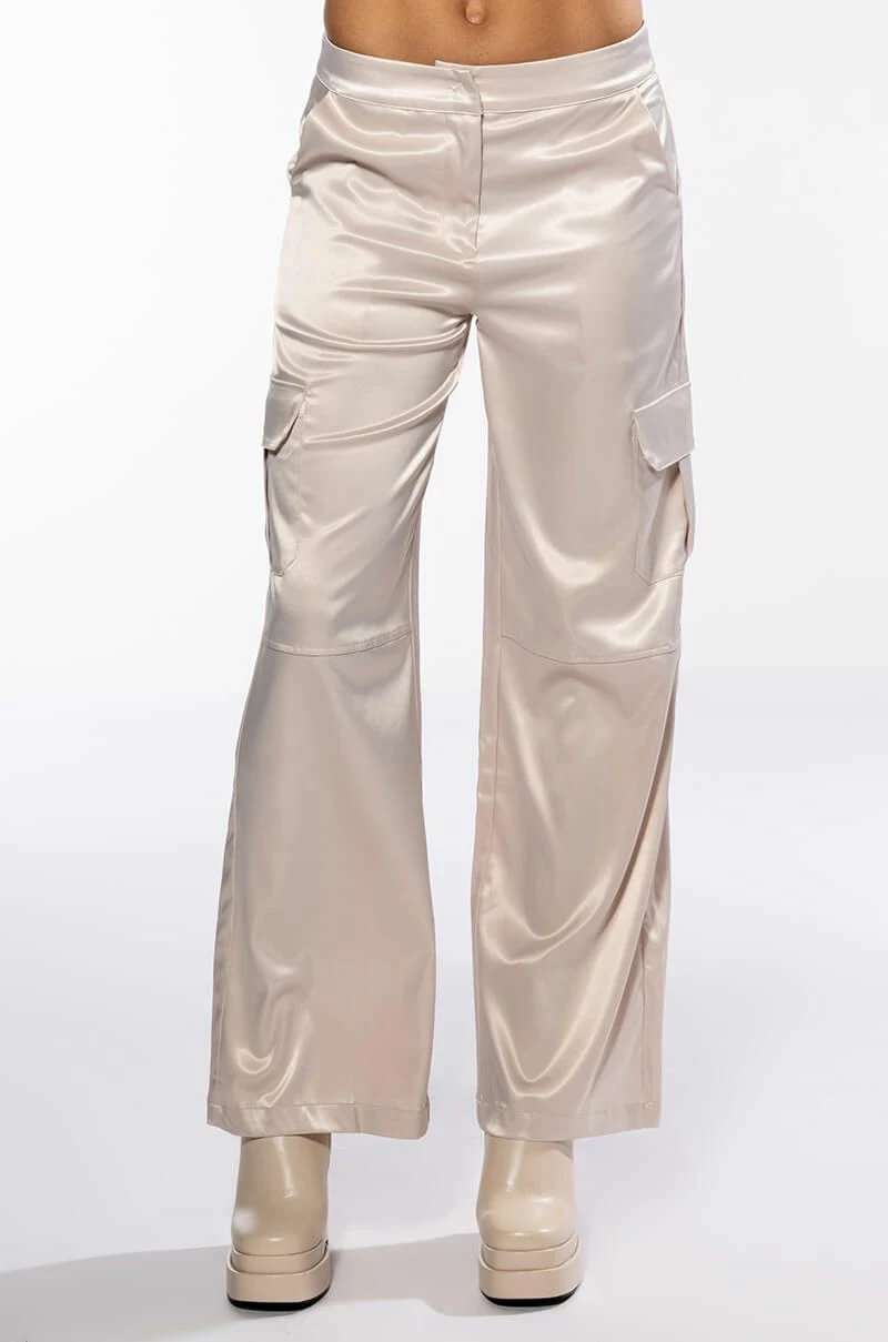 The AKIRA Label Nothing But Trouble Satin Cargo Pant is made from a slick satin fabrication and features a high rise waist, slant side pockets, four cargo flap pockets, a wide leg silhouette, and a zippered hook and bar front closure. Pair this piece with the coordinating AKIRA Label Nothing But Trouble Cropped Satin Bomber to complete your look.