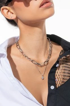 The AKIRA Label Nothing To Prove Layered Necklace Set is a set of two chain link necklaces each featuring a silver metallic base and lobster claw clasp. One features a circular rhinestone pendant, the other is an open link chain.