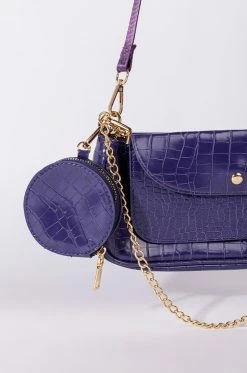 The AKIRA Label On Periodt Croc Eggplant Baguette is a chic baguette bag featuring a collage of clutches encapsulated in one chic convertible piece. This croc-embossed vegan leather number includes a slim zip top baguette bag base, an adjustable woven shoulder strap, a detachable flap front envelope clutch with chain link handle, and a detachable circular zip top pouch.