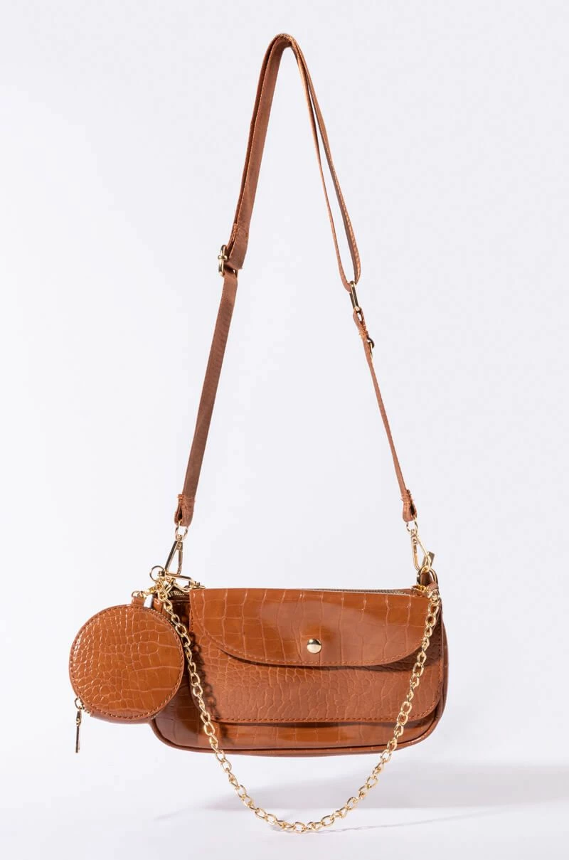 The AKIRA Label On Period Rust Baguette is a chic baguette bag featuring a collage of clutches encapsulated in one chic convertible piece. This croc embossed vegan leather number includes a slim zip top baguette bag base, an adjustable woven shoulder strap, a detachable flap front envelope clutch with chain link handle, and a detachable circular zip top pouch.