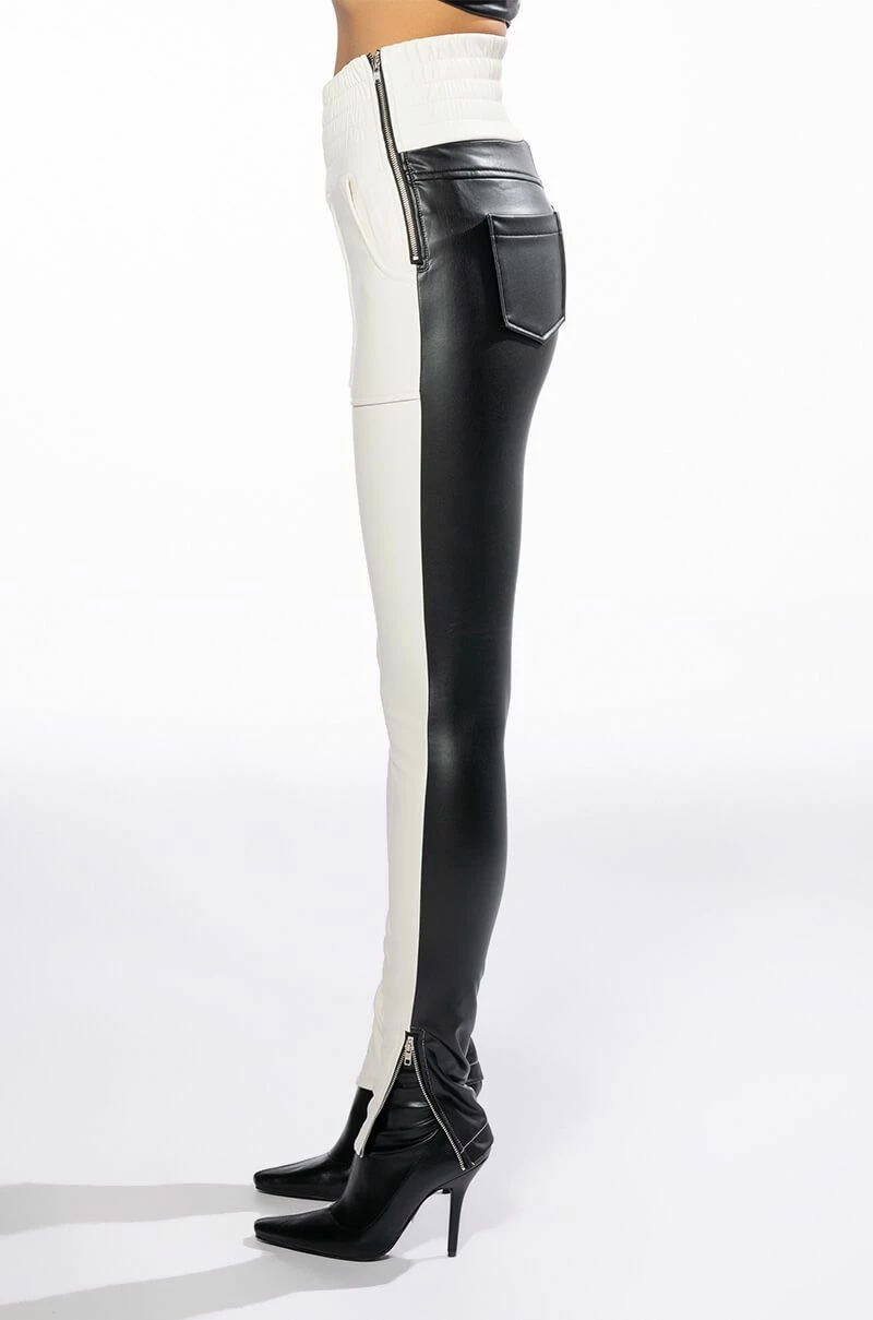 Stay lightyears ahead of the curve with The AKIRA Label Only You Two Toned Faux Leather Pant. Crafted from smooth synthetic leather, this jogger-style piece features a two-tone colorway, wide elastic waistband, working front and back pockets, and exposed zipper accents at the side and ankles. Style with your fave cropped hoodies and heeled booties for a unique fit.