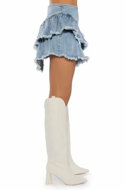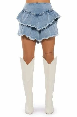 The AKIRA Label Que Bailes Con Migo Denim Layered Mini Skirt features a high waisted silhouette, a layered distressed denim design, a pointed hemline, and a zippered back closure. Pair with a bodysuit and chunky heeled boots to dance the night away!