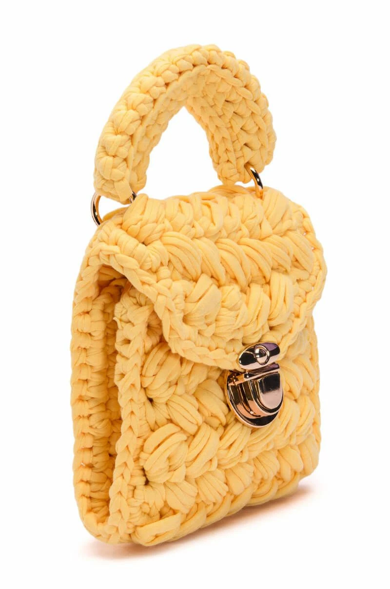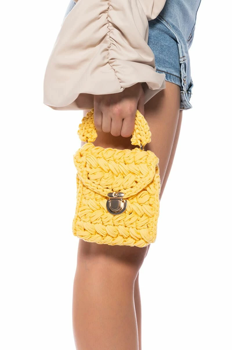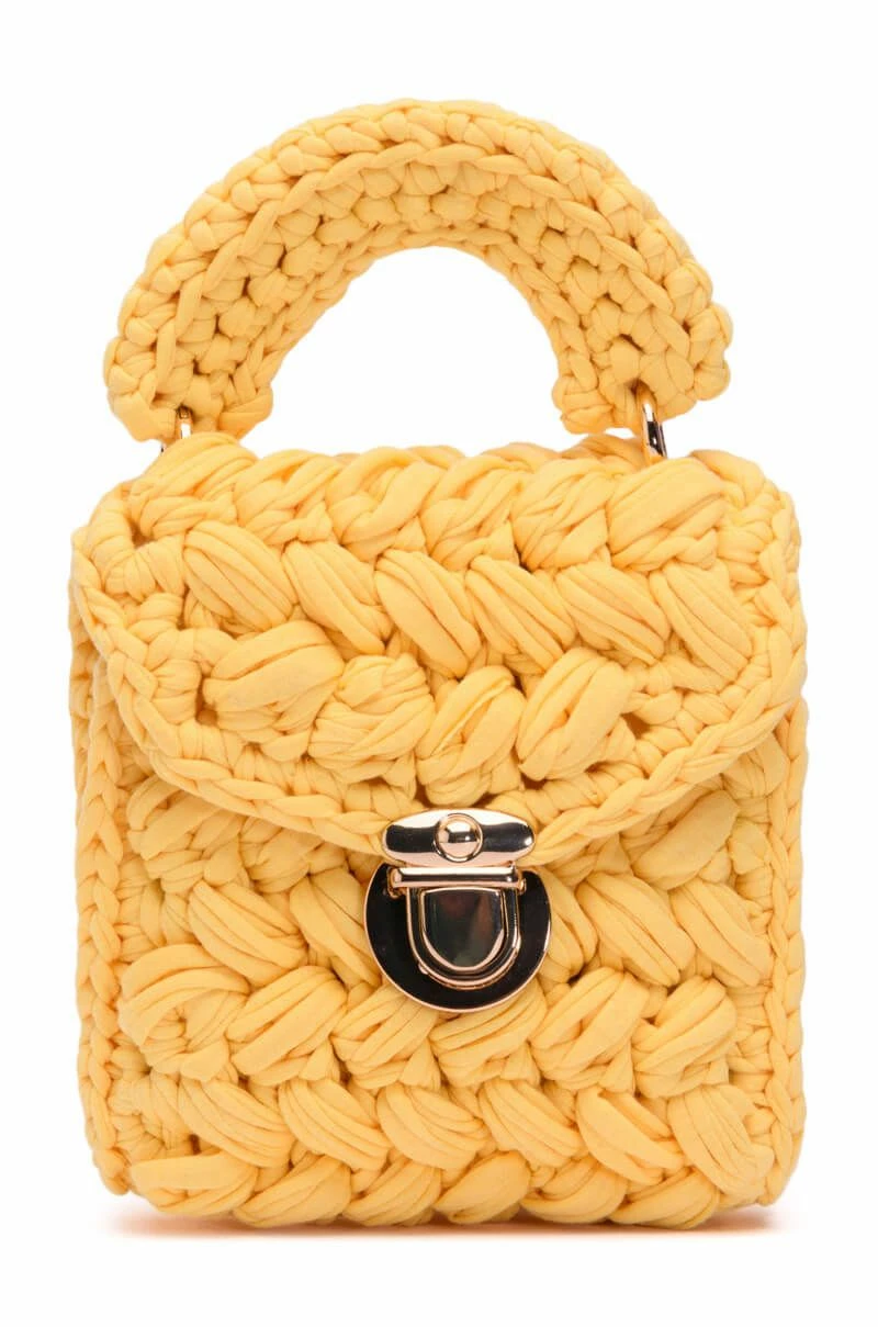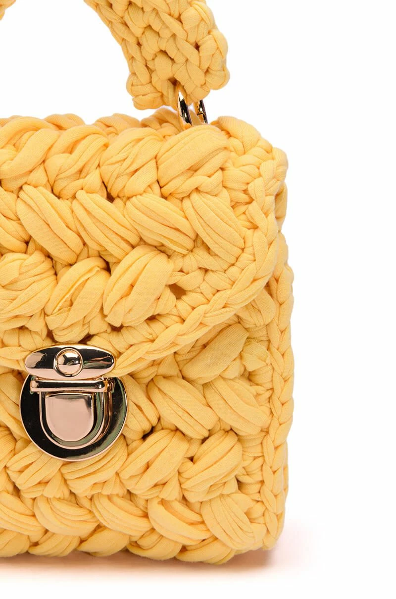 The AKIRA Label Rhebekka Woven Bag In Yellow features a woven fabric square box frame, a mini silhouette, a top handle silhouette, a coordinating detachable chain link shoulder strap, and a push button lock front closure.