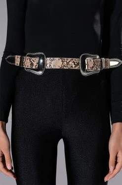 The AKIRA Label Rodeo Western Belt features a vegan leather base, snakeskin print patterning, dual silver metallic buckle closures, and flat silver studded detailing. Sits atop the waist for a cinched look.