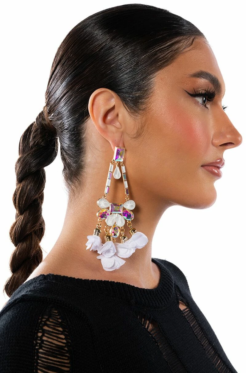 The AKIRA Label Romanticize Life Earring are made from a faux gold metal base and feature iridescent gemstones, a drop dangle silhouette with a gem lobe post, and cascading rhinestone and floral petal accents. Complete with post back fastenings.