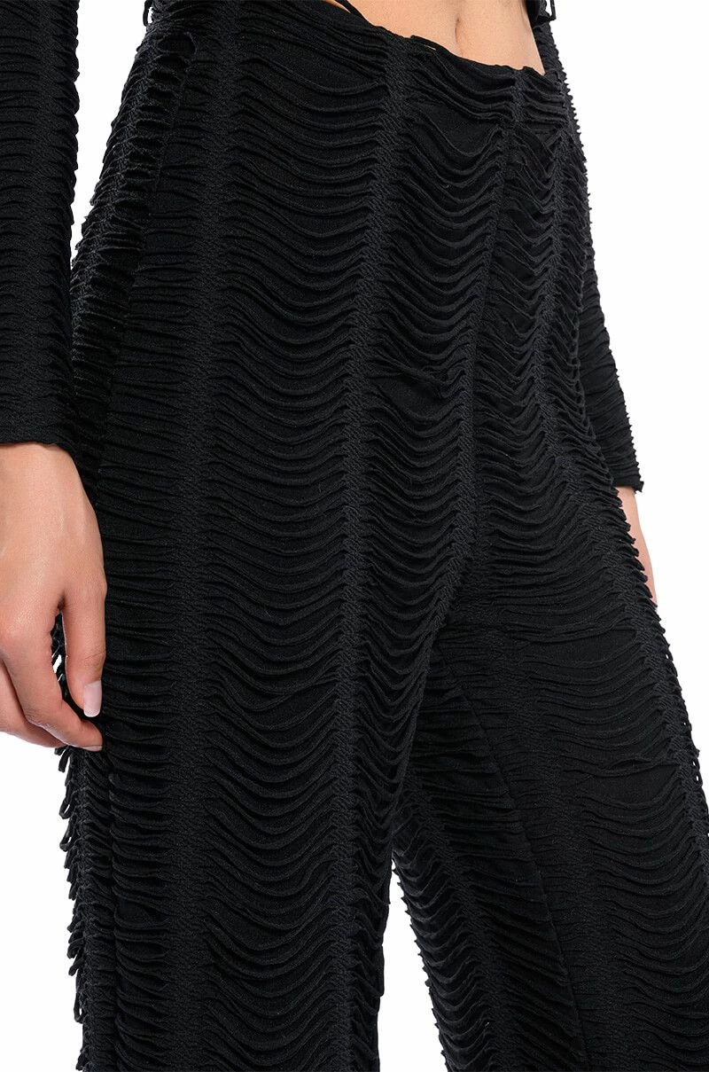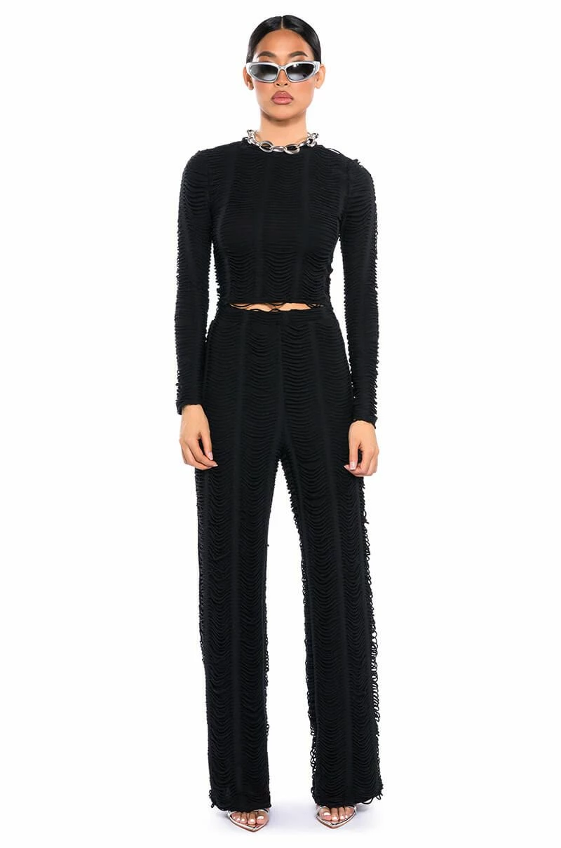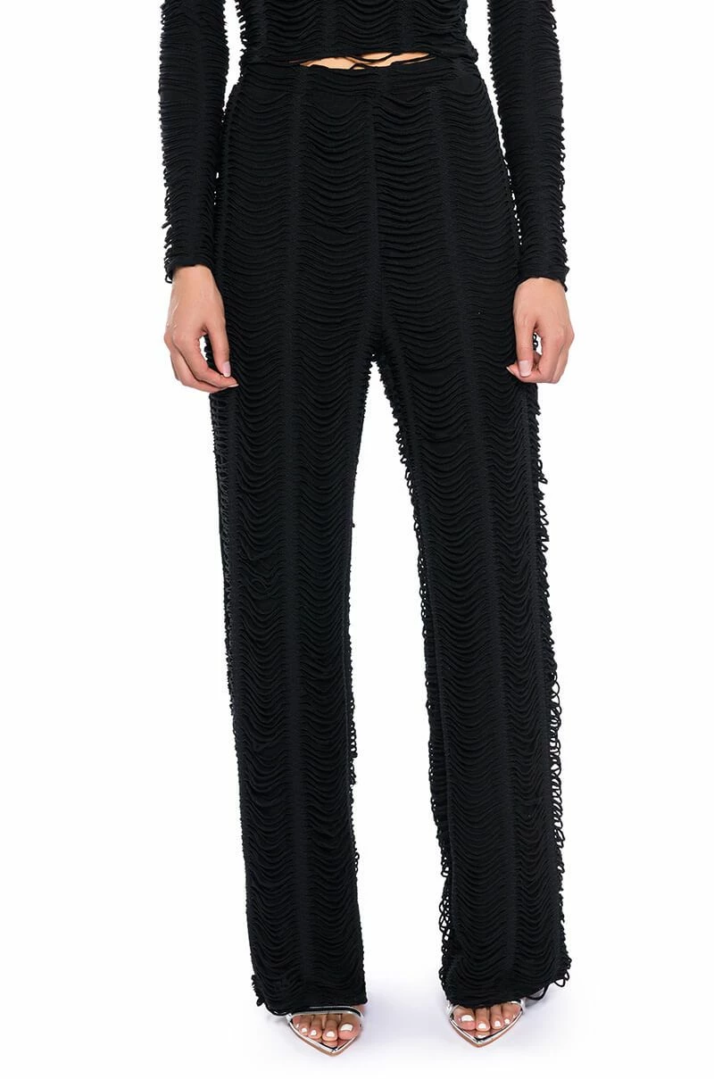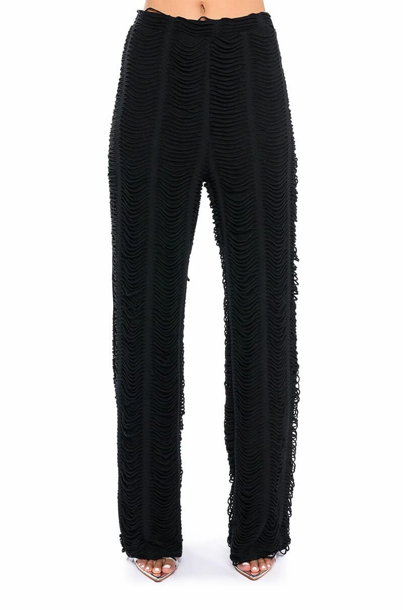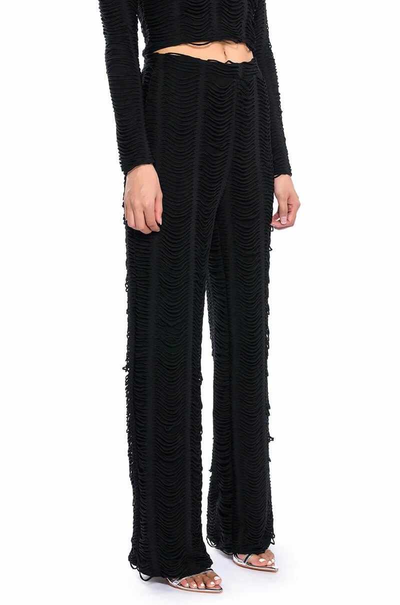 The AKIRA Label Running With The Wolves Textured Pant is made from a soft and stretchy knit fabrication and features a high rise waist, an elastic waistband, a shredded texture top layer, a straight leg silhouette, and a pull-on fit. Pair this piece with the matching AKIRA Label Running With The Wolves Textured Top to complete your look.