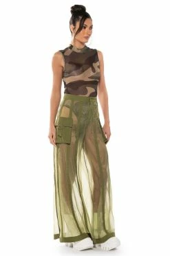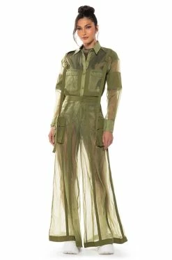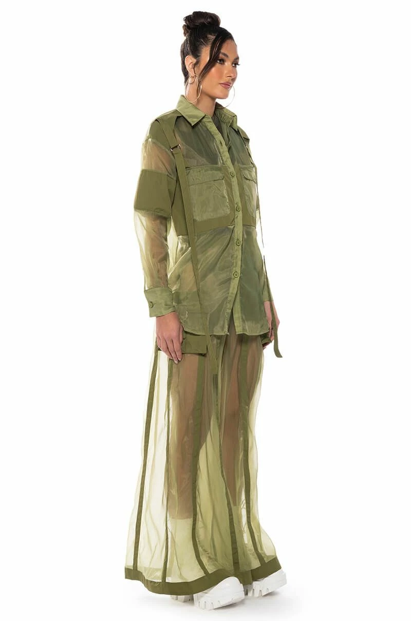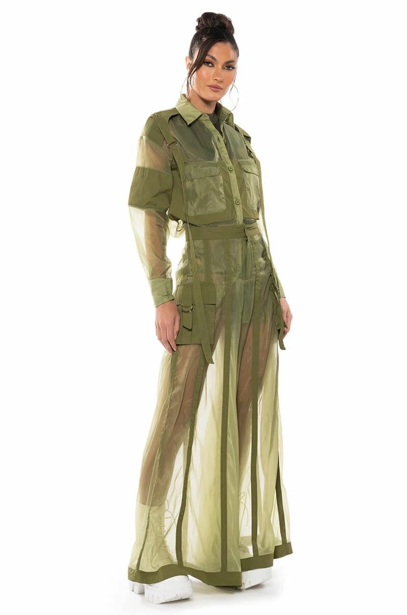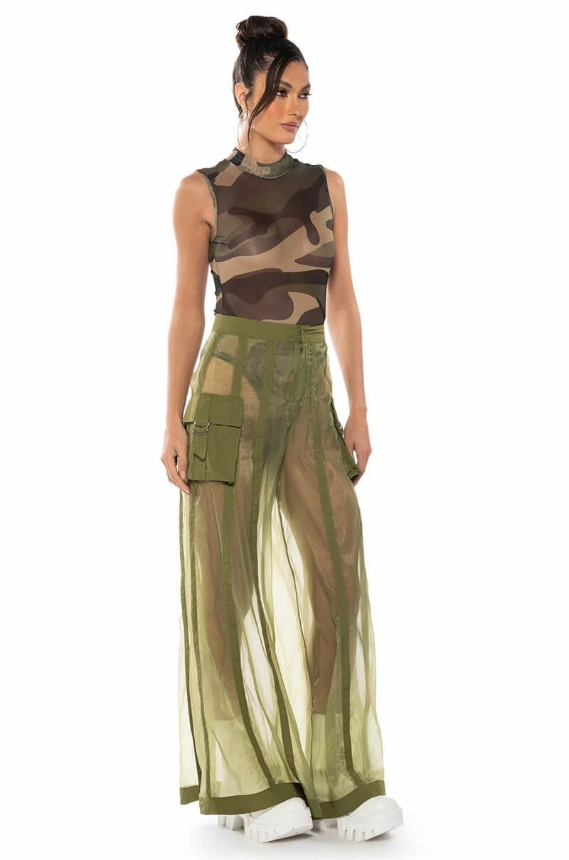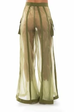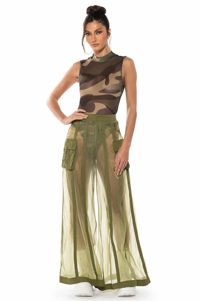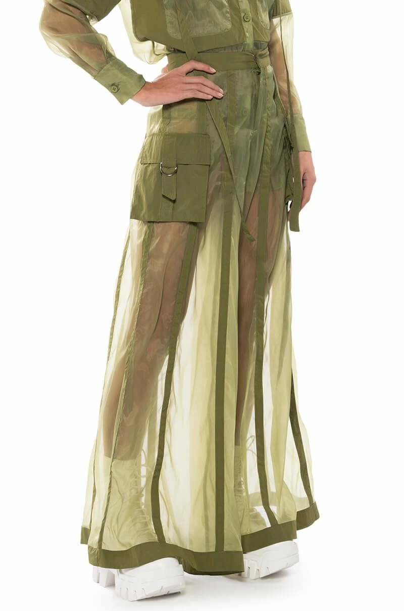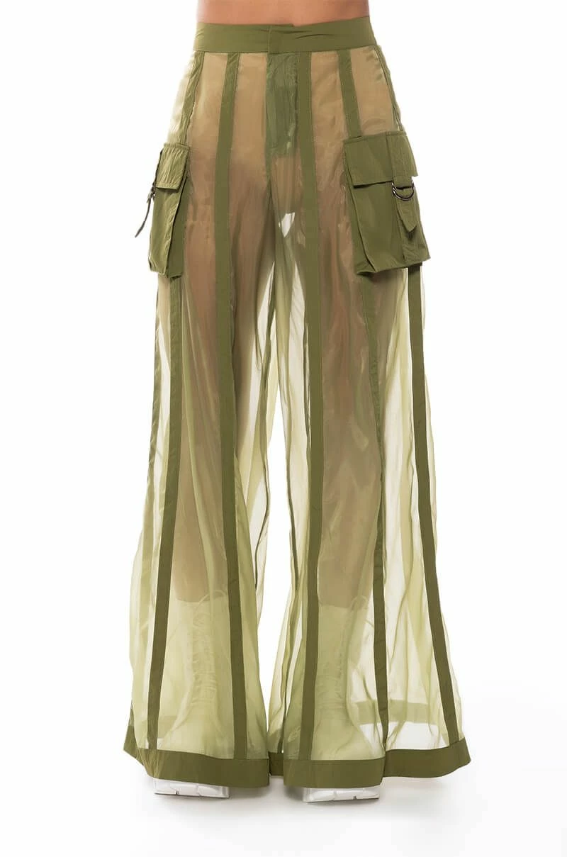 The AKIRA Label Sage Wide Leg Trouser is part of a flowy chic two-piece set, made from a sheer, polyester base fabrication and featuring a striped mesh paneling design, a high waist, buckled cargo flap pockets on the sides, and elastic at the back waist for a more comfortable fit. Complete with an extra wide leg silhouette and a zip-up to hook-and-eye front closure. Style with the coordinating top, The AKIRA Label Sage Button Down Shirt, for a finished look.