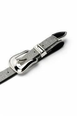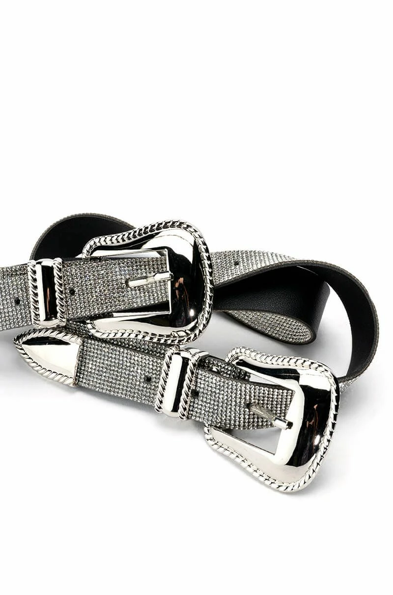 The AKIRA Label Sawyer Western Belt features a flexible pleather base, silver metallic hardware, a double buckle design, and a rhinestone overlay. This glamorous piece sits at the waist for a cinched look.