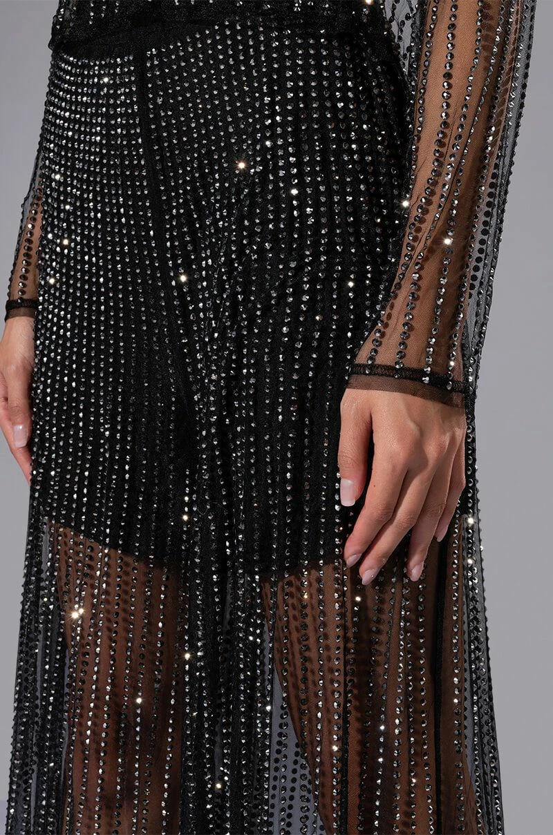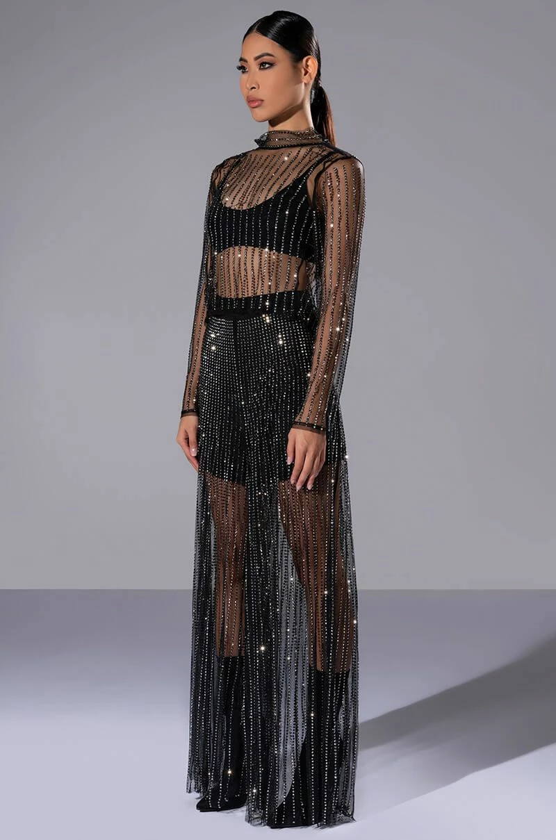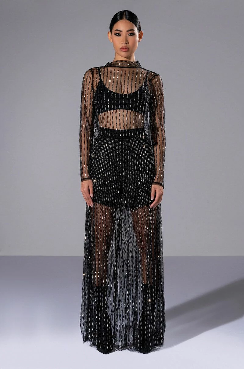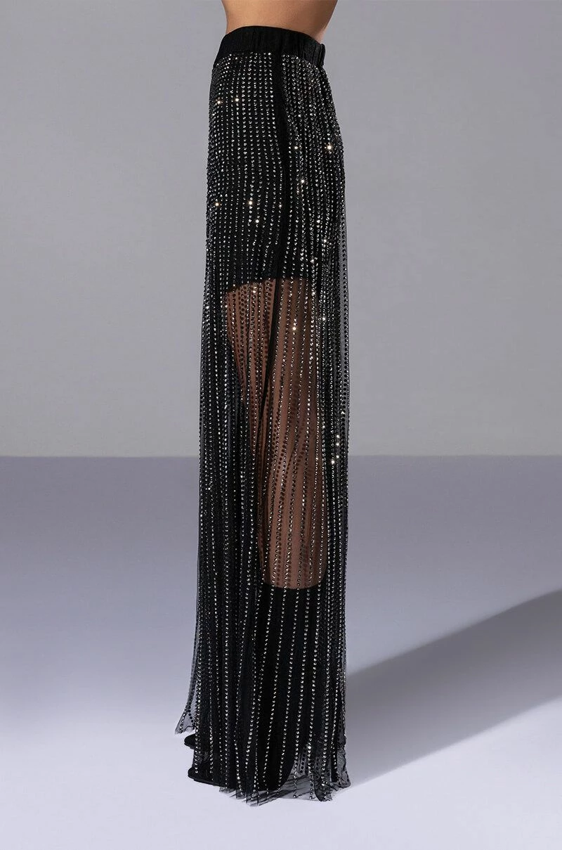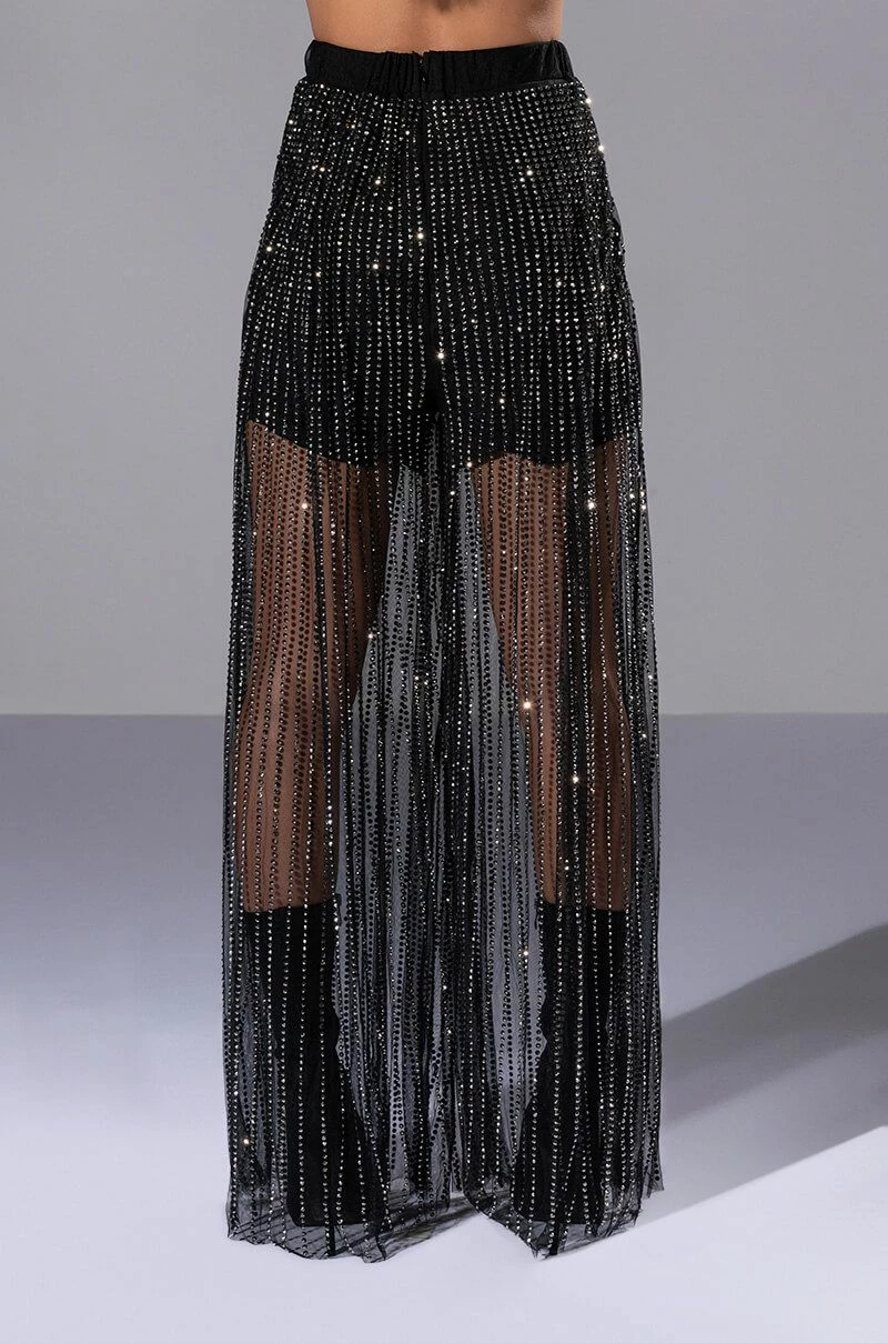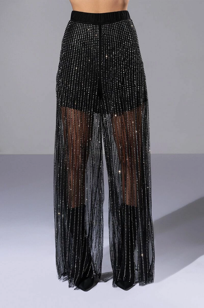 Weβre in LOVE with The AKIRA Label Glam Night Out Mesh Wide Leg Pants! These bottoms are made from a sheer mesh fabrication and feature all over shiny striped rhinestone embellishments. Complete with a high waist rise, elastic waistband, built in