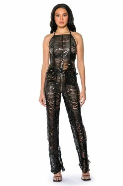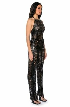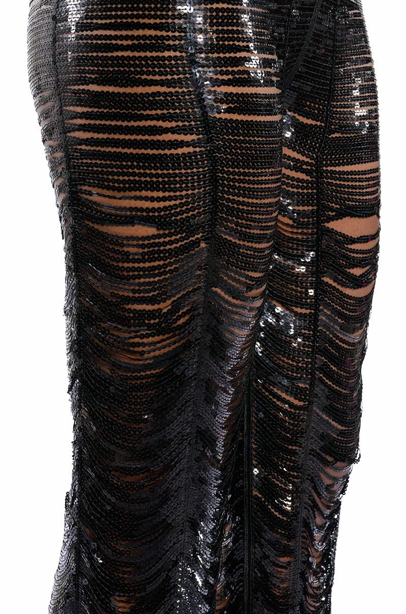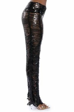 The AKIRA Label Senorita Embellished Straight Leg Pant In Black is made from an iridescent, unlined sequin link fabrication, featuring a high waisted silhouette, and a sexy, cascading sequin embellished design. Complete with a long straight leg design and a back zipper closure. Pair this piece with the coordinating AKIRA Label Senorita Embellished Halter Top and heels to complete the glam look.