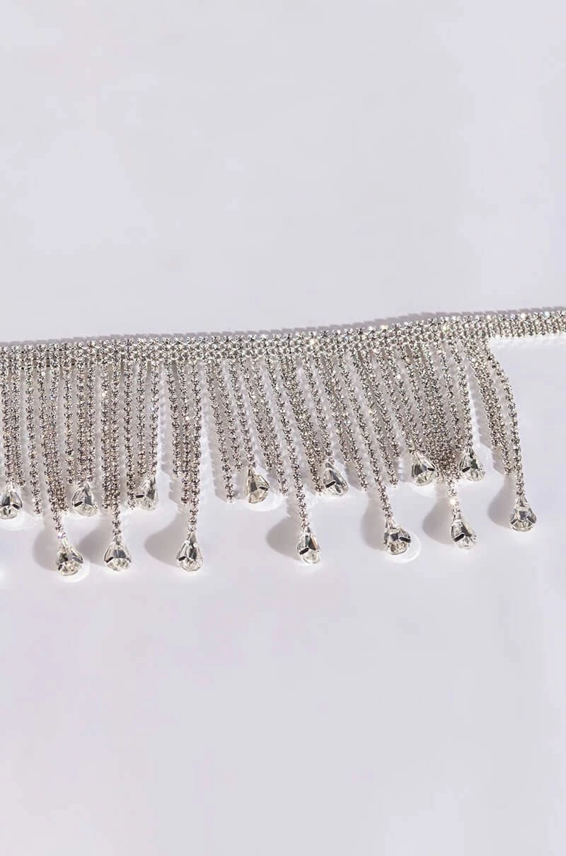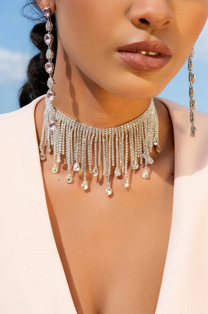 The AKIRA Label She’s A Maniac Dropping Choker features a rhinestone link base, dangling rhinestone fringe, rhinestone teardrop accents, and an adjustable lobster claw fastening.