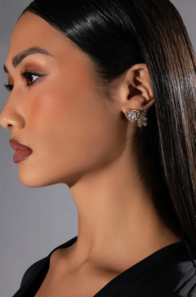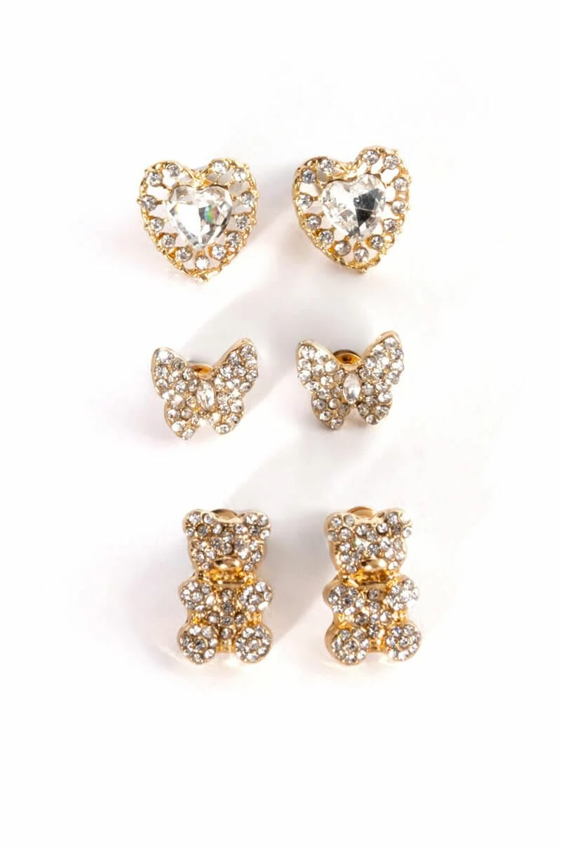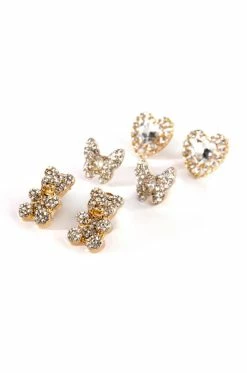 Add a touch of whimsy to any ensemble with The AKIRA Label Short N Sweet Rhinestone Stud Set! This collection features three stud earrings rendered in a faux gold metallic base. Includes a heart-shaped rhinestone stud, a rhinestone butterfly stud, and a teddy bear-shaped rhinestone stud. Complete with post back closures.