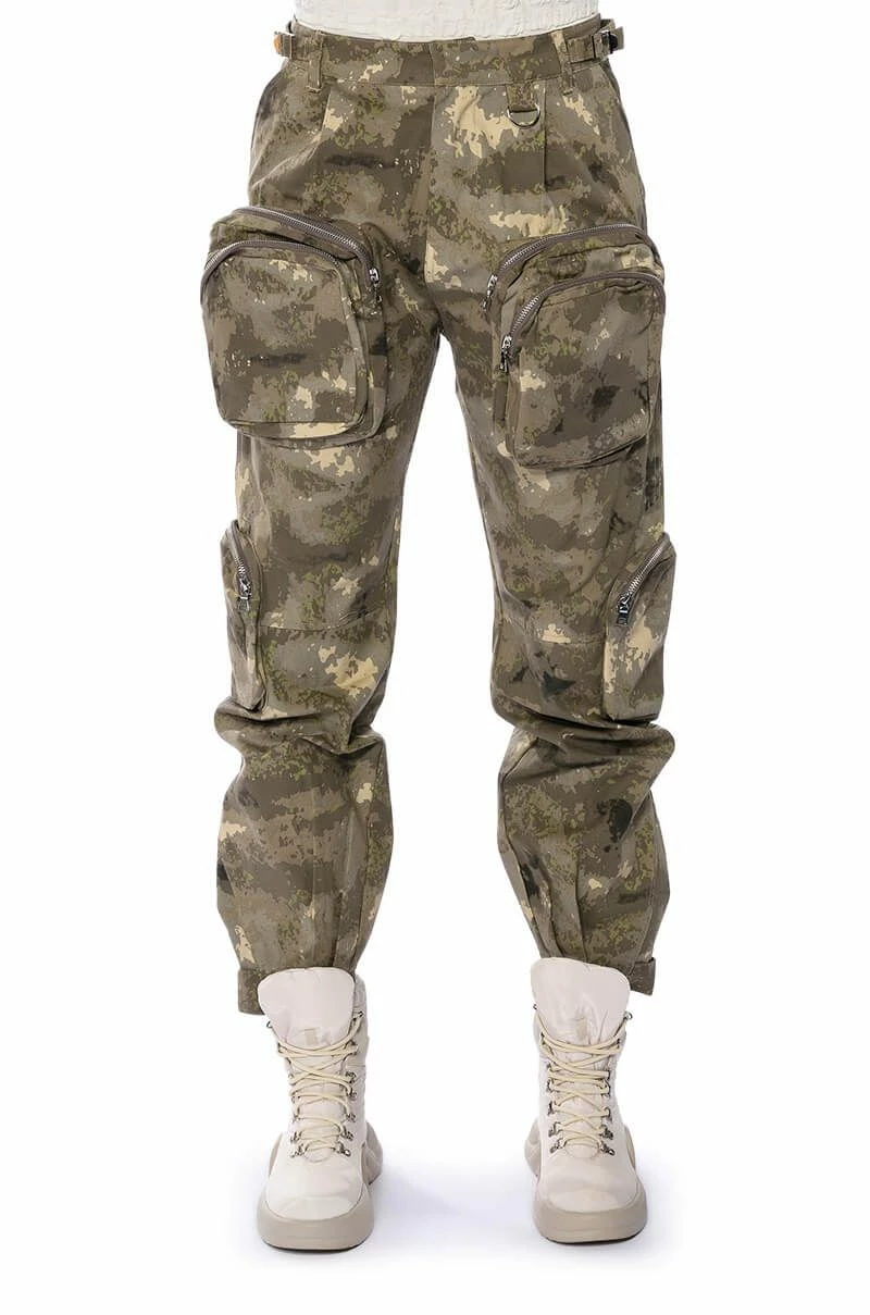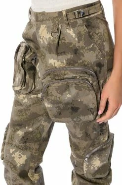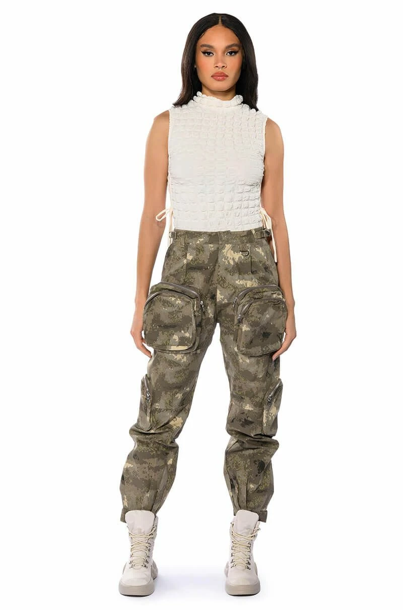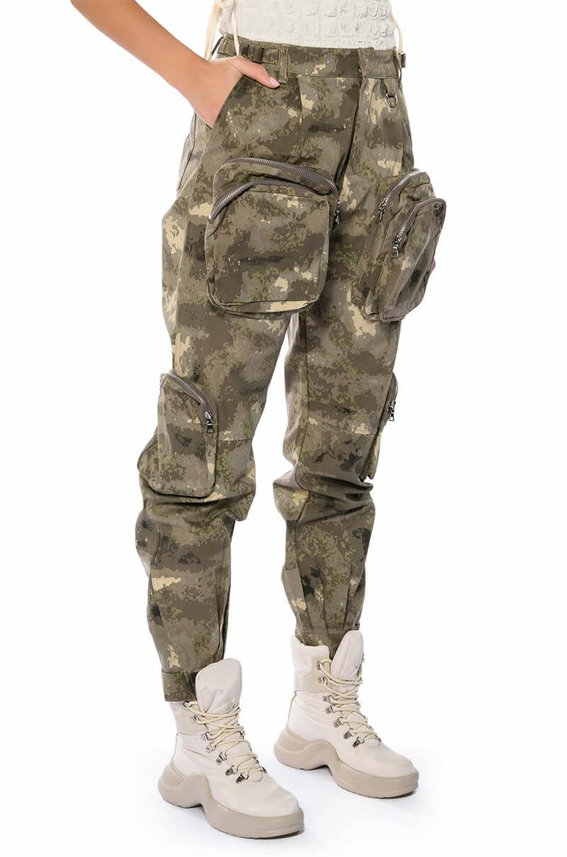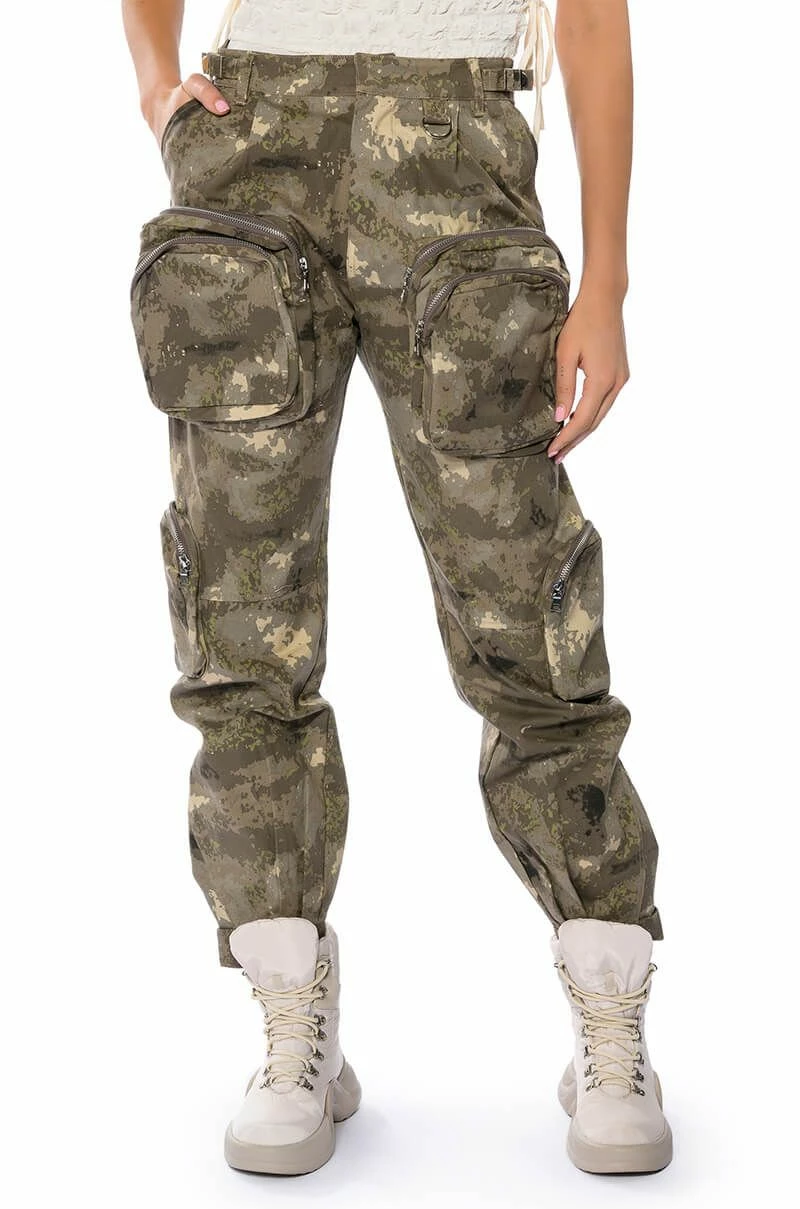 Pull up fashionably late in The AKIRA Label Show Up Pocket Detail Cargo! These cargo pants feature a structured, cotton and camo print fabrication, an ultra high rise silhouette, a zip-up snap button front closure, mini belts at the waistband, and large front and side zippered cargo pockets. Complete with a parachute pant silhouette, adjustable velcro strap hems, utility seaming, and back pockets. Pair with your fave mesh long sleeved bodysuit and heels for that hot girl look.