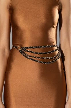 The AKIRA Label Supermodel Chain Link Belt features a faux gold chain link base, a faux leather ribbon belt construction, draped chain link accents, and an adjustable lobster claw clasp.