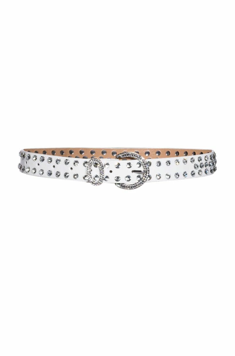 The AKIRA Label Tap In Embellished Belt is a faux leather waist belt featuring studded rhinestone gem detailing and a rhinestone-embellished pin buckle closure.