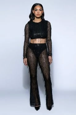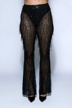 We’re in LOVE with The AKIRA Label Tonight Is The Night Sequin Pants! They are a sheer mesh flare pant featuring an all over iridescent sequin fringe design. Complete with a high waist rise, a built in panty, wide flare hems, and a pull on fit. Finish the look off with the matching top, The AKIRA Label Tonight Is The Night Sequin Long Sleeve Top!