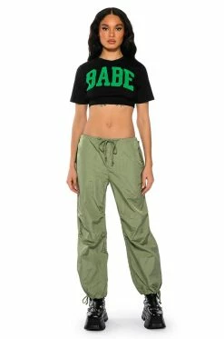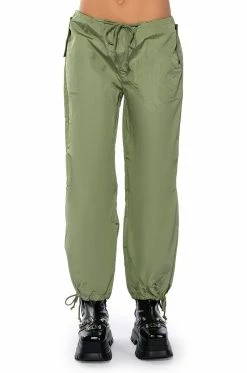 The AKIRA Label Too Legit Wide Leg Cargo Pant in Green is a lightweight parachute pant featuring a windbreaker-inspired fabrication, a high rise waist, button flap slant side pockets, and a drawstring waistline. Complete with tonal drawstring hems detailing.