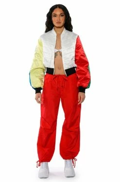 The AKIRA Label Too Legit Wide Leg Cargo Pant in Red is a lightweight parachute pant featuring a windbreaker-inspired fabrication, a high rise waist, button flap slant side pockets, and a drawstring waistline. Complete with tonal drawstring hems detailing.