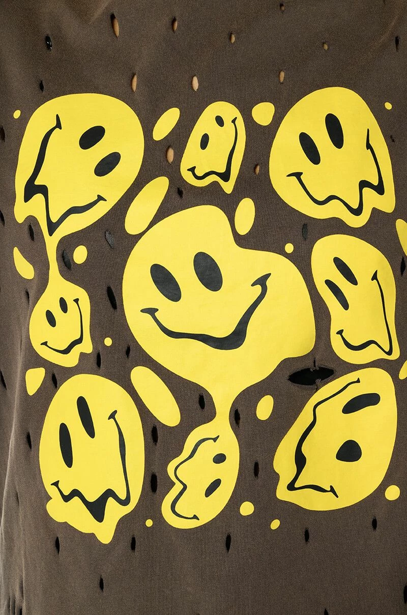 The Trippy Trippy Distressed Crew Neck Tshirt is made from a stretchy cotton fabrication and features a crew neckline, short sleeves, and an oversized silhouette. Complete with a trippy, warped smiley face graphic print and distressed hole detailing. Pair this graphic piece with distressed denim and combat boots to finish off your grungy casual look.