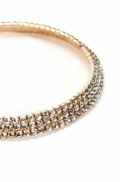 The AKIRA Label Twinkle Like Me Statement Necklace is made from a faux gold metal base and features a choker silhouette, layered rhinestone links, and an adjustable lobster claw closure.
