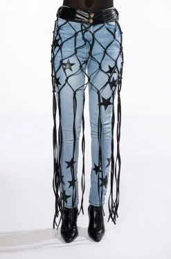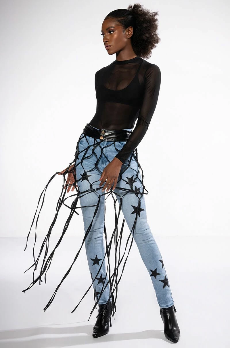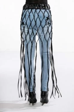 The AKIRA Label Tying The Knot PU Skirt Belt is a unique, edgy layering piece made from a faux leather fabrication featuring a knotted base, fringe detailing, a ruched elastic back band, and a double button front closure. Style over a shirt dress for added sex appeal.