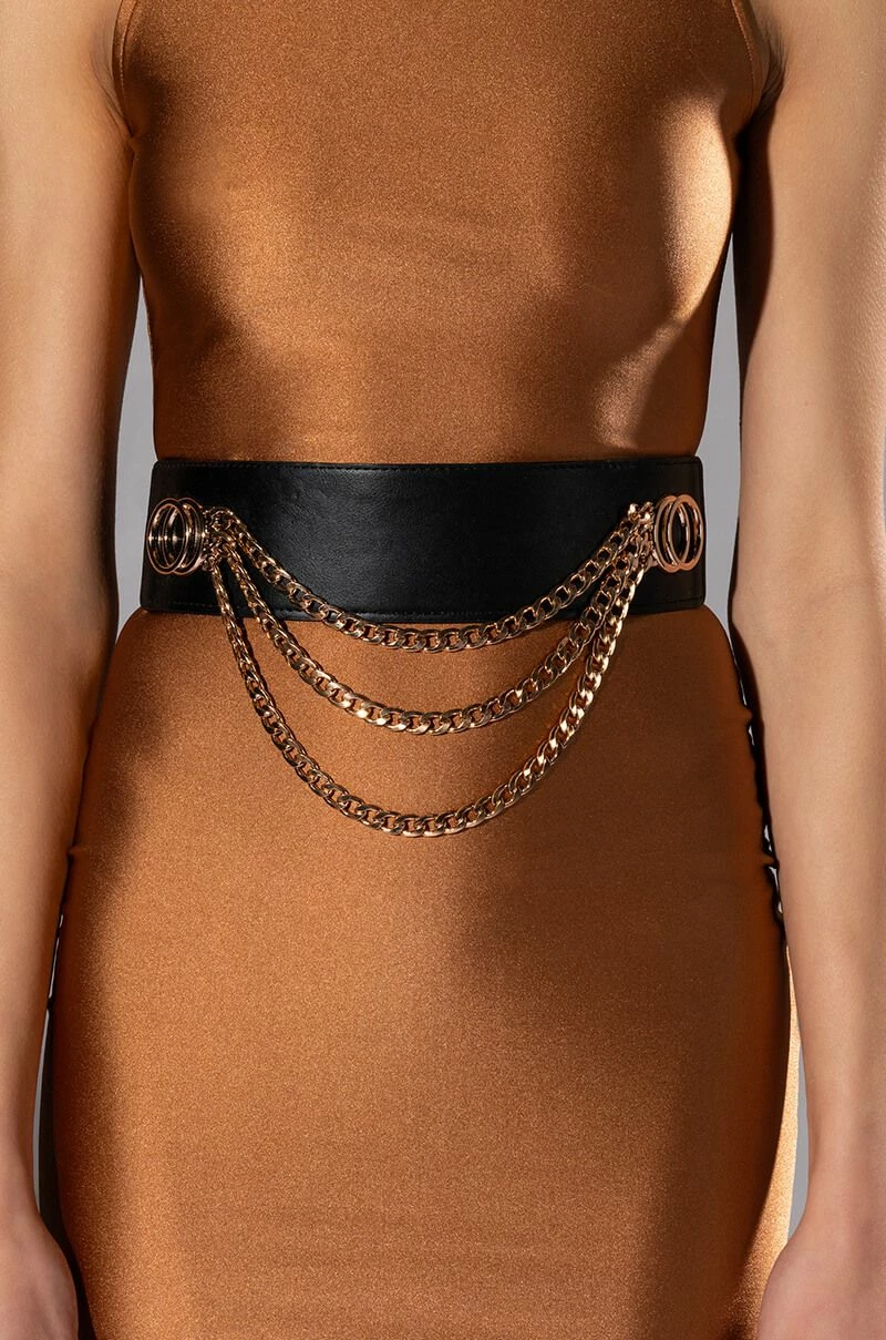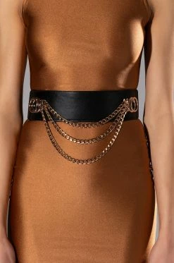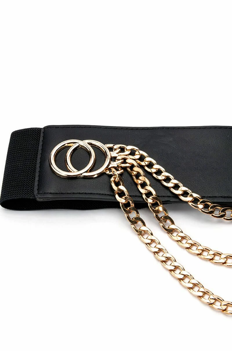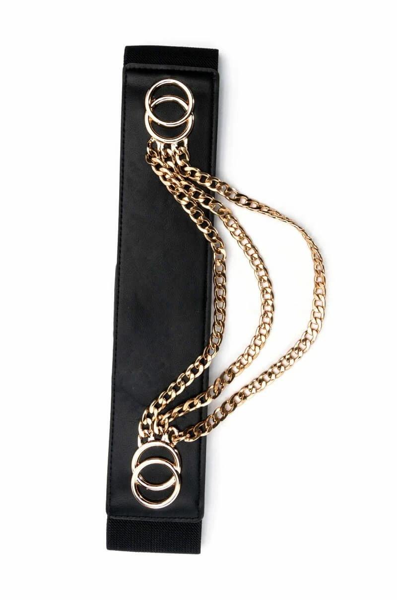 The AKIRA Label Wild Ones Chain Stretch Waist Belt features a vegan leather base, circular faux gold metallic accents, draped chain link detailing, elastic side panels, and button back closures. This edgy accessory provides a luxe look.