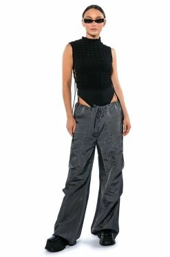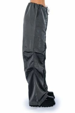 The AKIRA Label Zona Oversized Parachute Pants feature a slick windbreaker-inspired fabrication, a high rise toggle drawstring paperbag waist, slant side pockets, a wide leg, relaxed fit, and subtle, sporty tonal seam detailing. Pair this piece with a bomber jacket and chunky sneakers to complete your look.